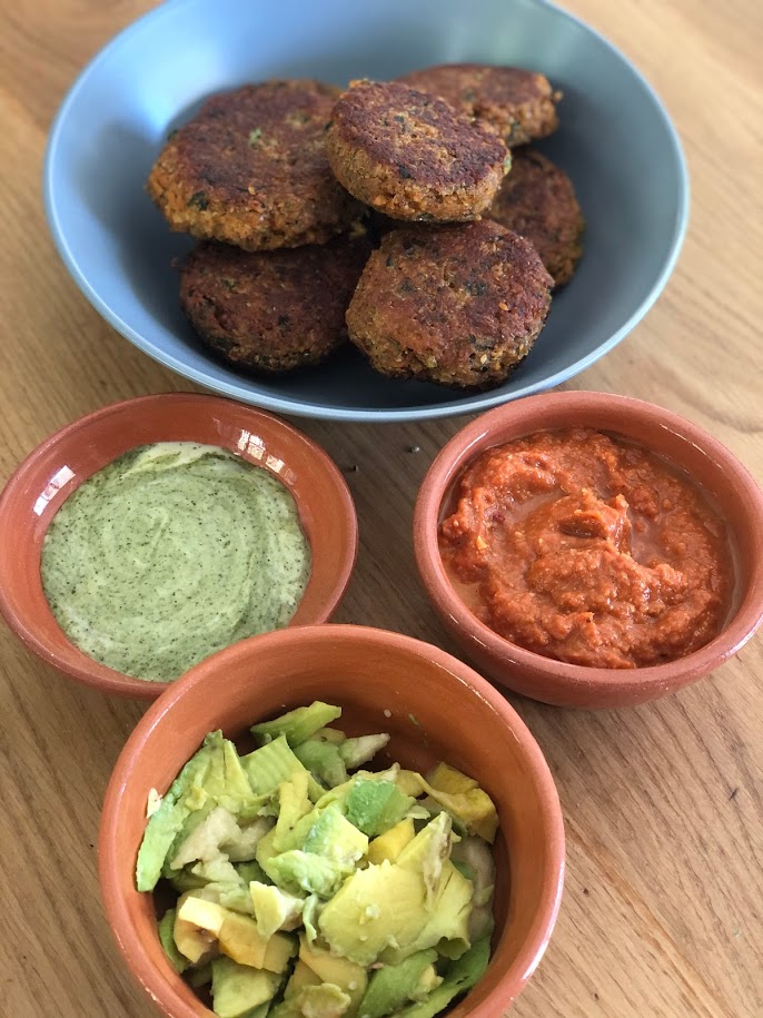 I served with a minty mayo , sun-dried tomatoe pesto , mushed avo and salad stuff ( onion Cucumber etc )