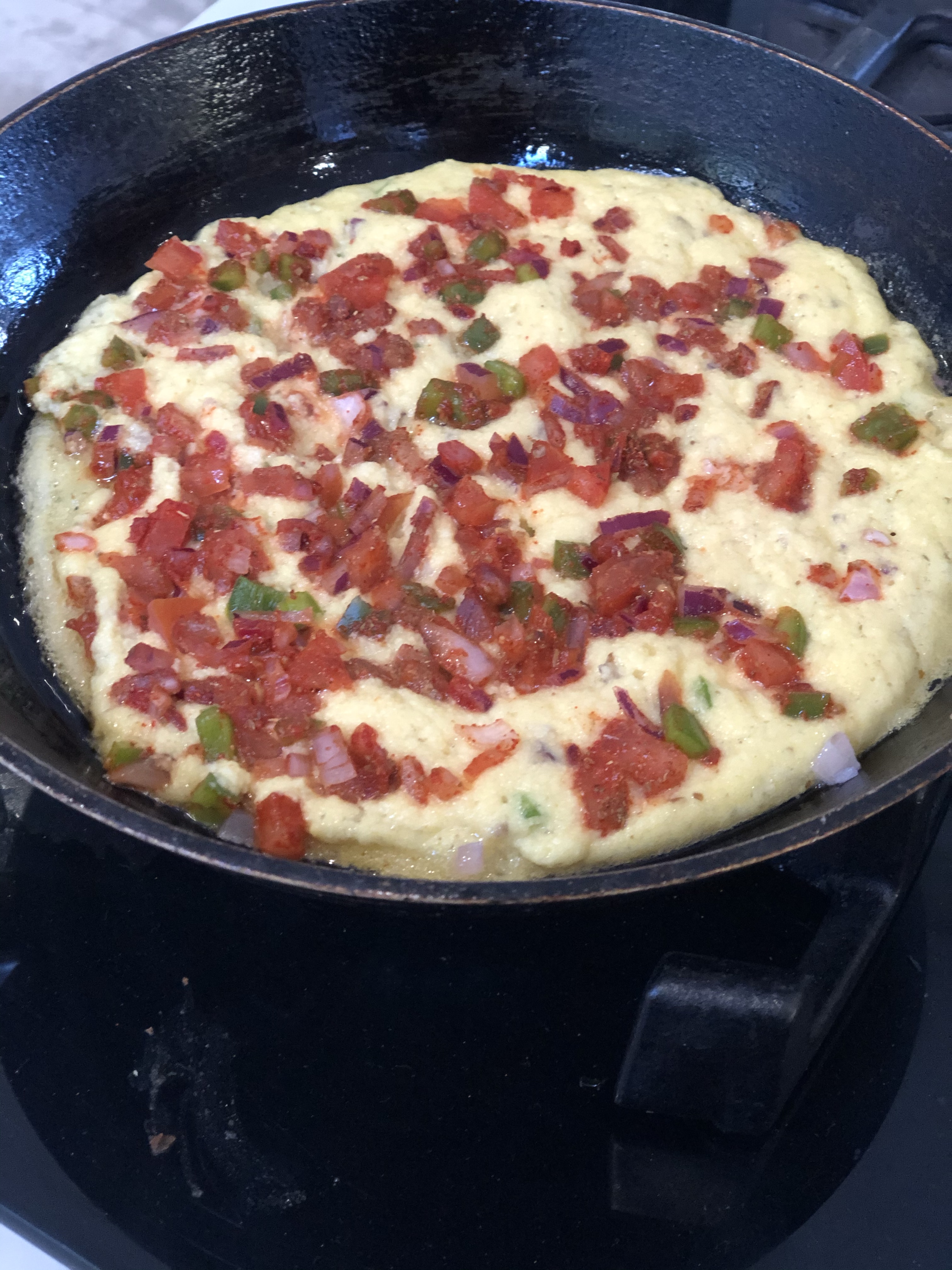 - Add seasoning ( salt , turmeric, dhania, jeera powder) and finely chopped veggies ( onion , green pepper , tomatoes , green chili)