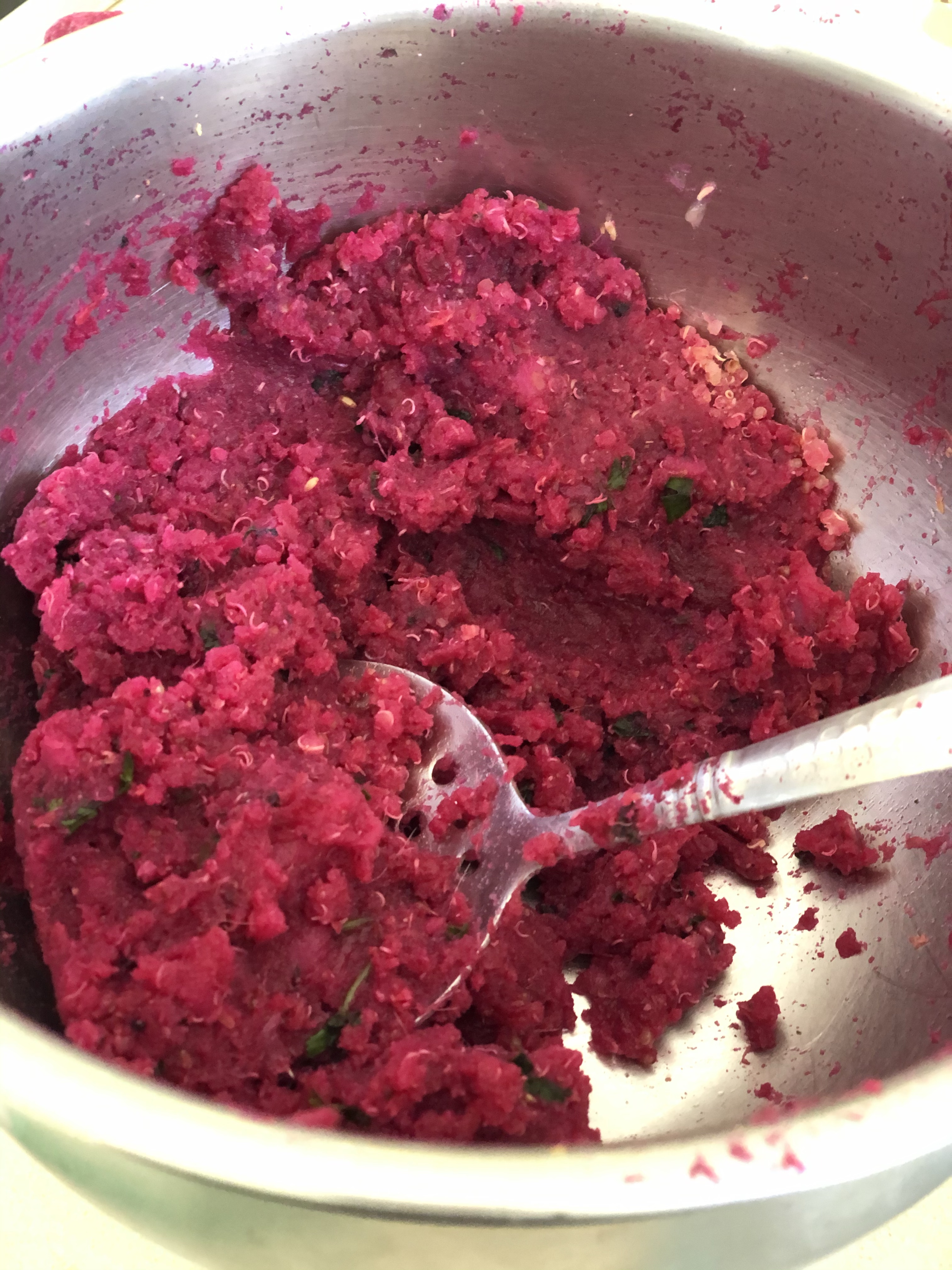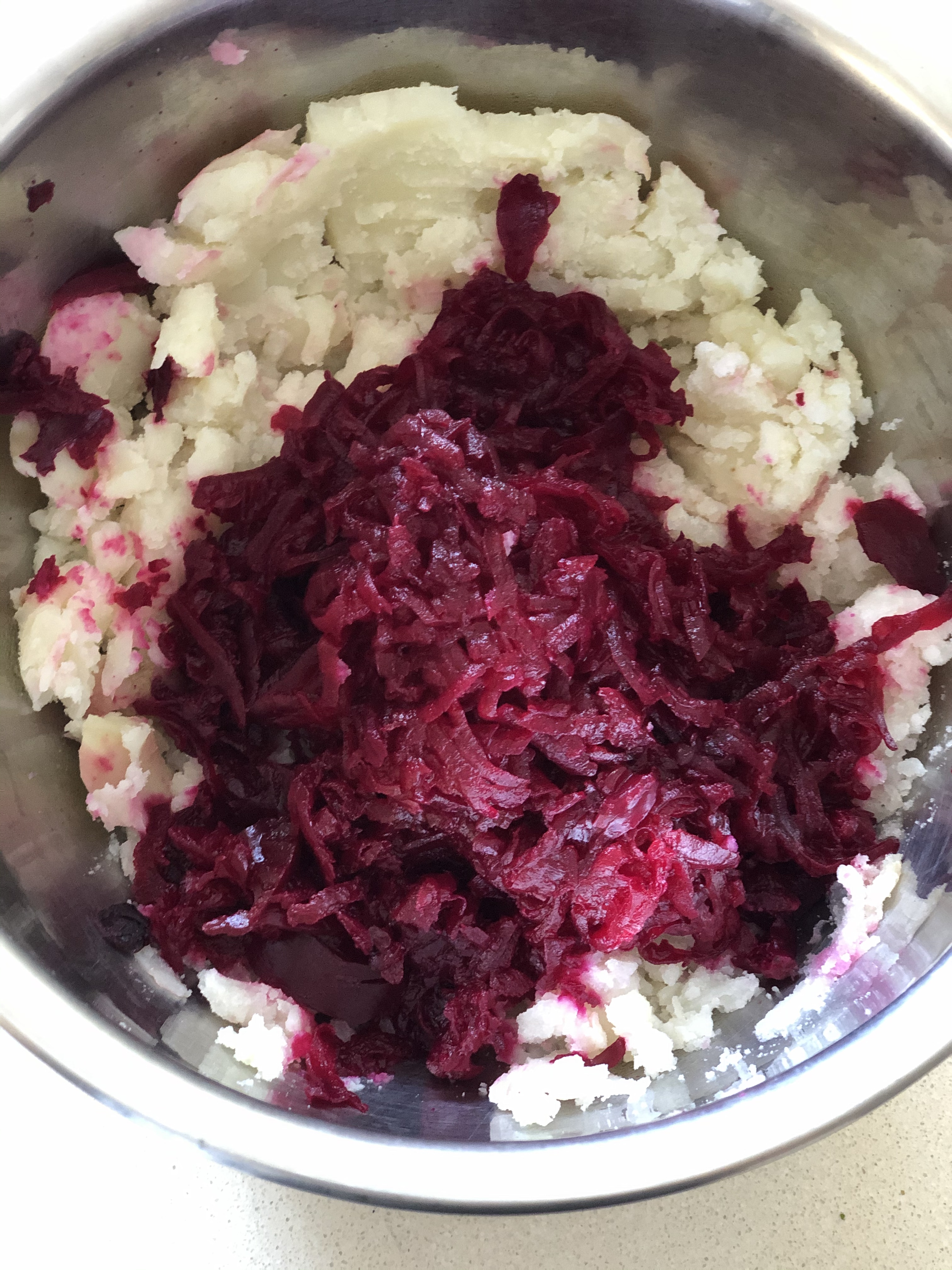 - To the mashed potatoes , add the beets and spices .Bind them together. Refrigerate for a few minutes. Make in small balls – slightly flatten and pan fry to crispen .