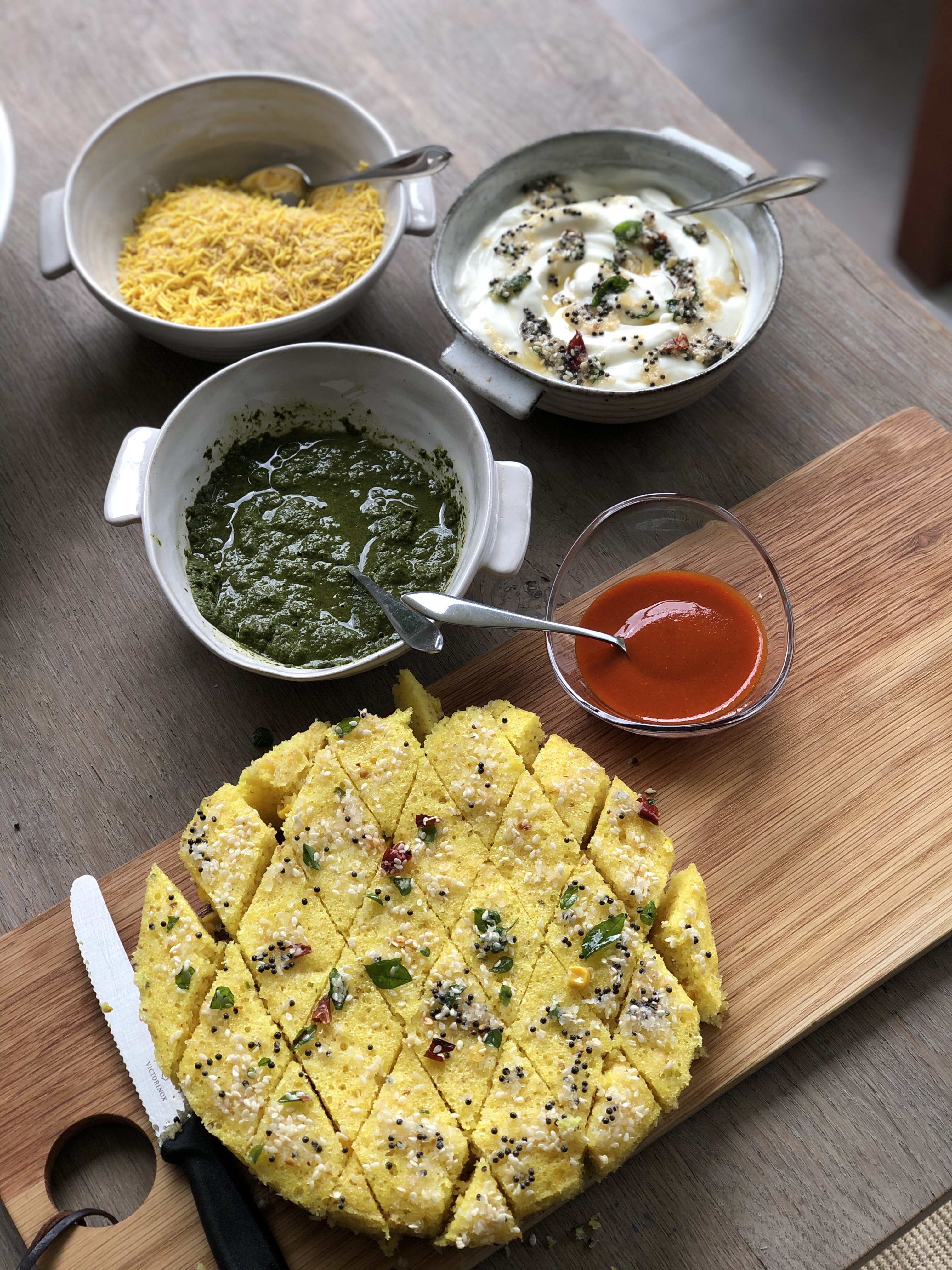 Upon the rare occasion there are leftovers ( I usually double up and do 2 batches if I want extra as my kids can polish the one tray on a good morning) you could try Dhokla , a green chutney , a dollop of yoghurt and a crowing glory of crispy sev. If you want to take that one step ahead…Dhokla Chaat. Yes , you read right. I’ll leave you thinking .