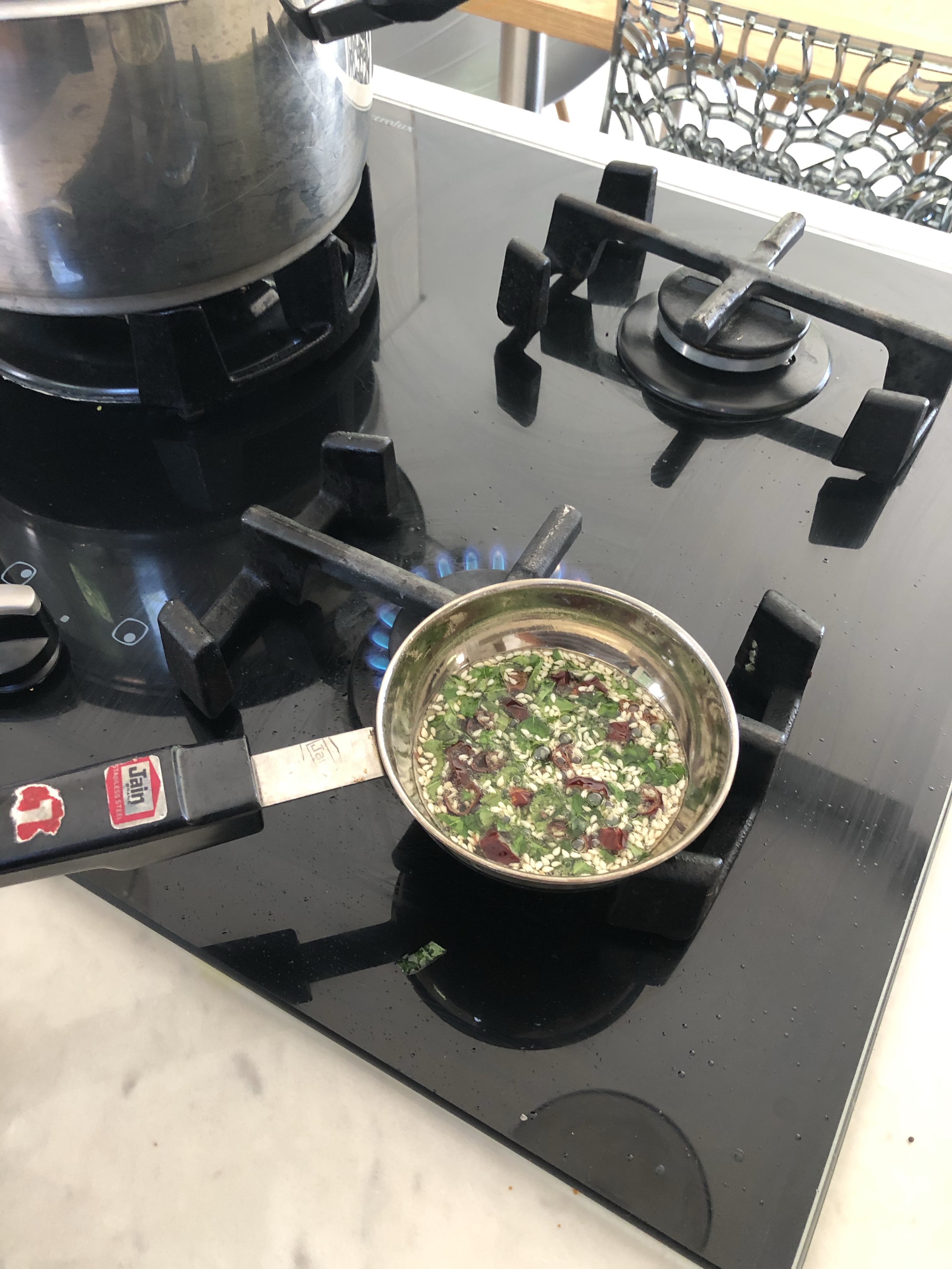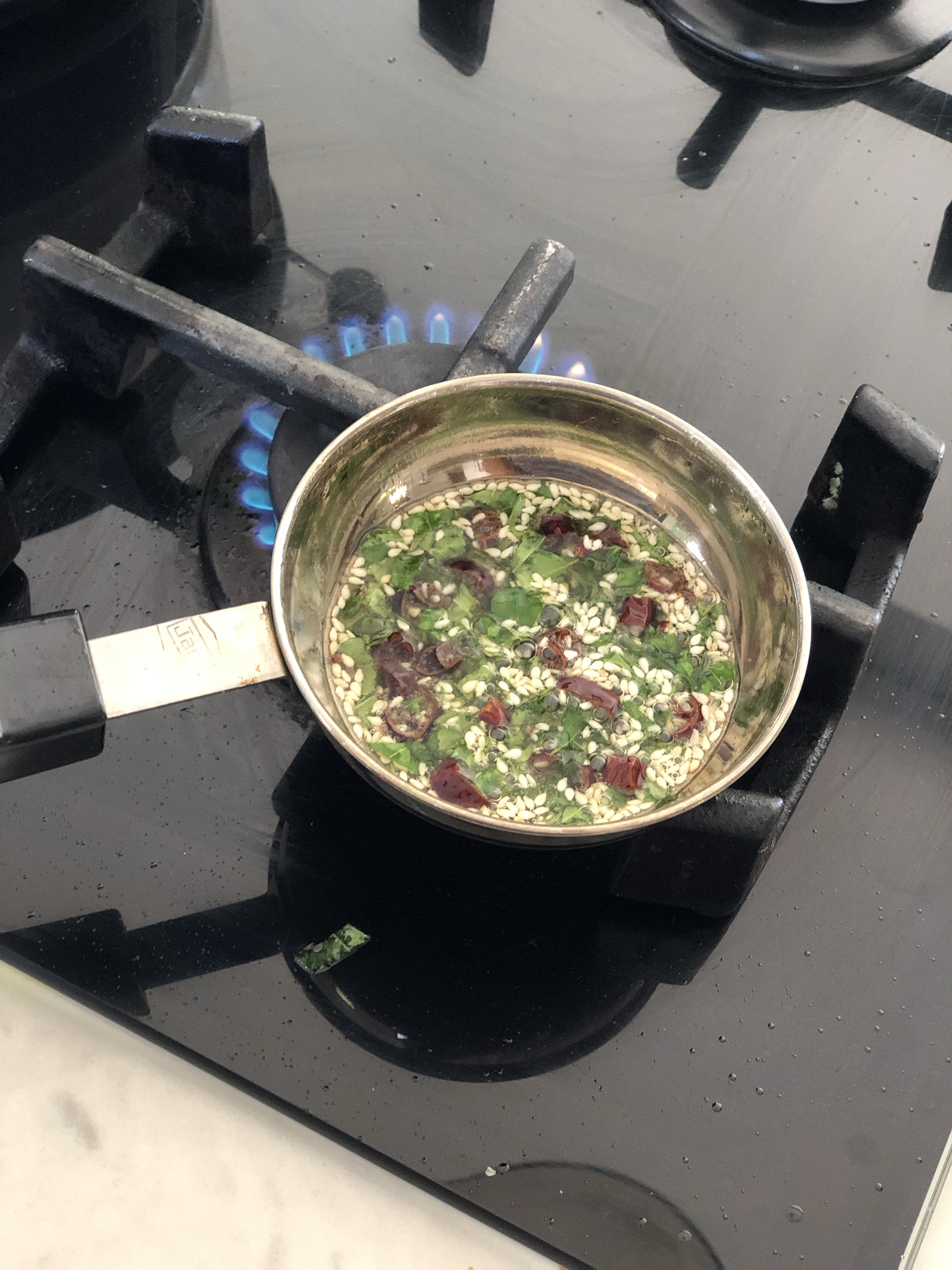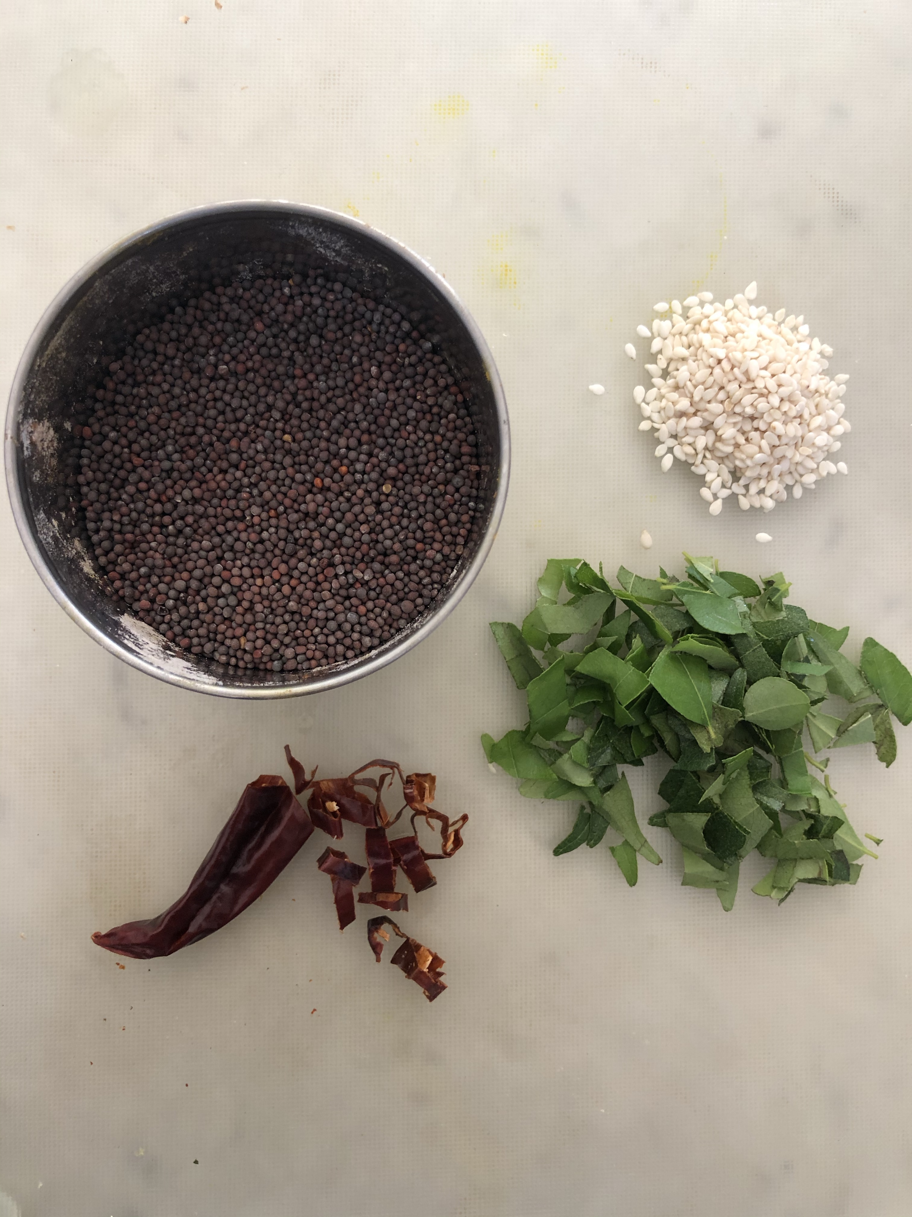 - Heat a little oil in a frying pan – add black mustard seeds , curry leaves and a red chilli – allow to crackle – add sesame seeds