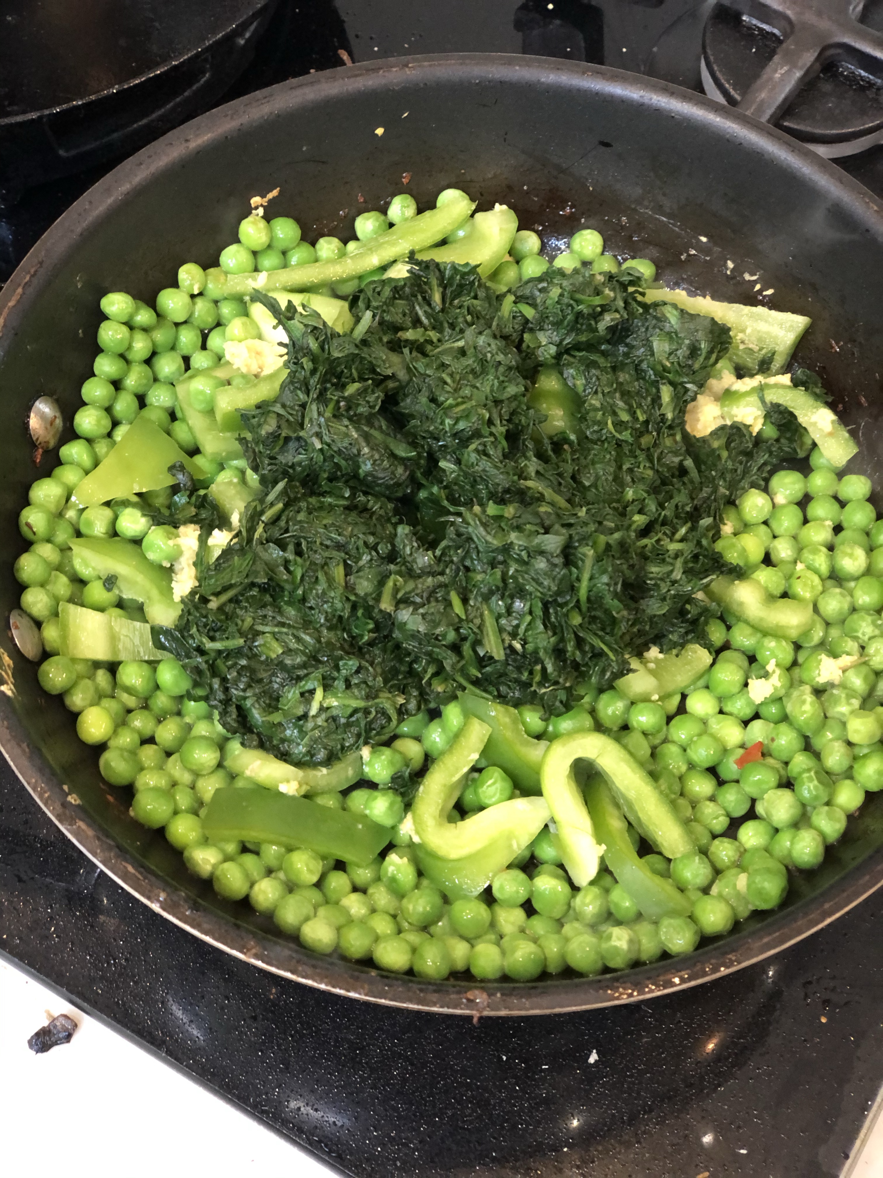 - 2 1/2 cups worth Greens ( peas , green pepper and spinach – green beans can be used too )