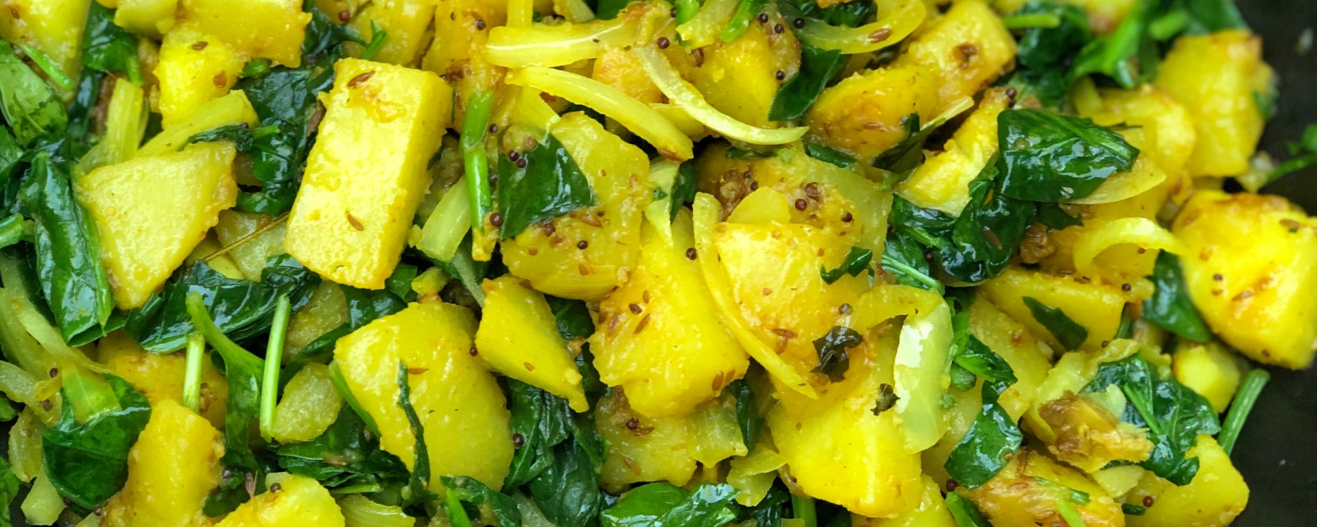 Try These bright beauties to ease into the week … soft fluffy potatoes braised in ginger, turmeric and coriander powder with onions added later in the cook to caramelise , and spinach tossed in at the last minute.