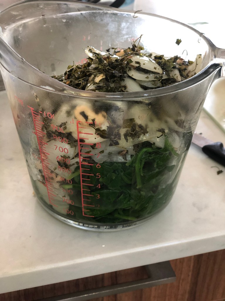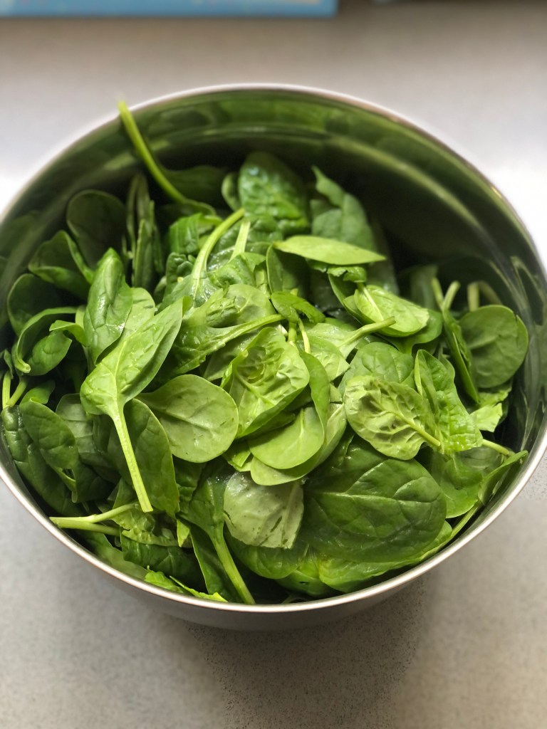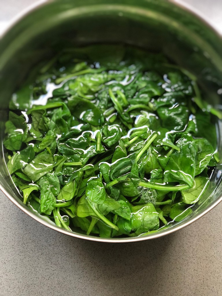 - Blanche spinach leaves in hot water for a few moments , then rinse in cold water. Set aside. You want to wilt the leaves but not sit too long in the hot water , keeping the bright green color in tact.