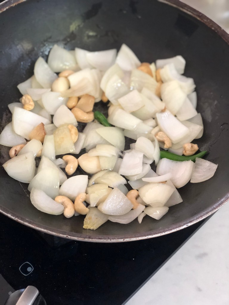 - In a pan add ghee , once melted add roughly chopped onions , garlic , chilli and cashews. You want the onions to soften slightly and garlic and cashews to get aromatic. No need to brown, you want the onions translucent and sweet.