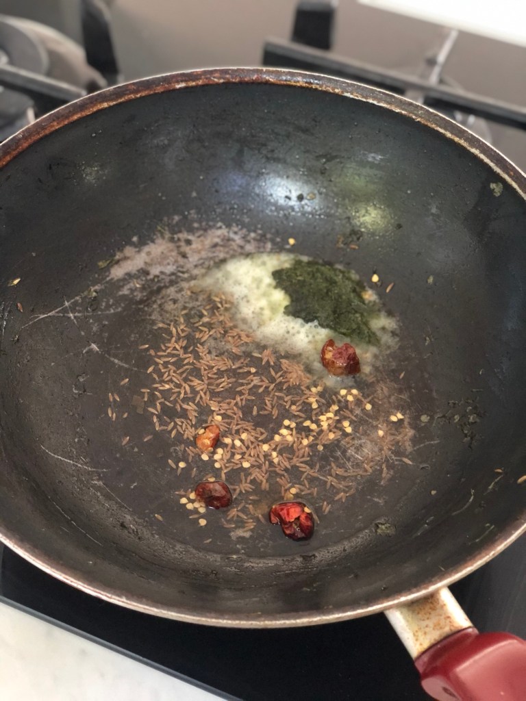 I did a quick braise of ghee , cumin seeds , curry leaves and cashews.