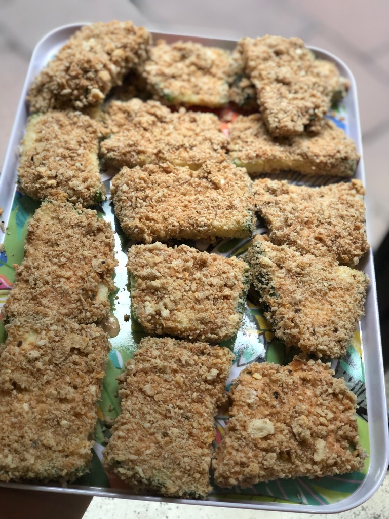 Marrow , mushroom , eggplant or tofu make great vessels for a crispy Katsu. It is first dipped in a flour batter then crumbed in Panko.