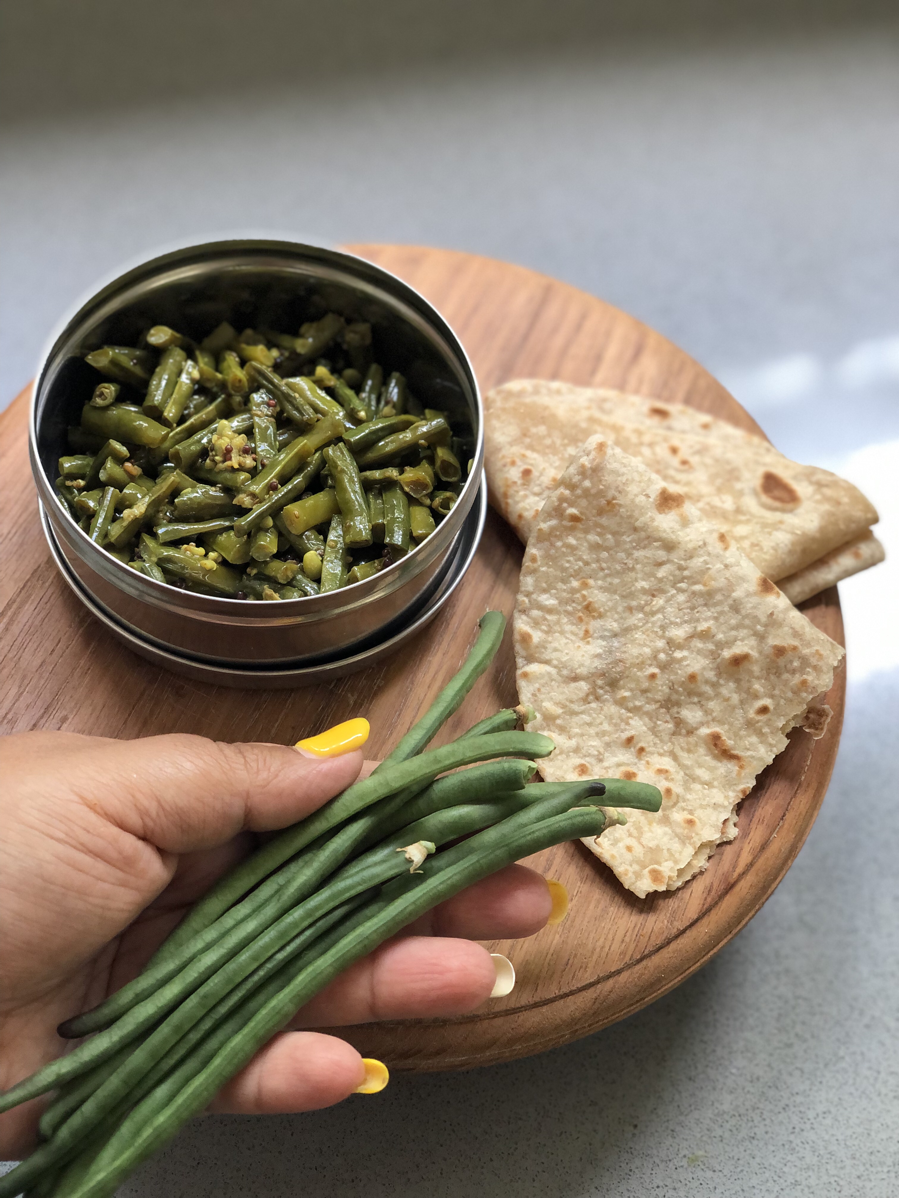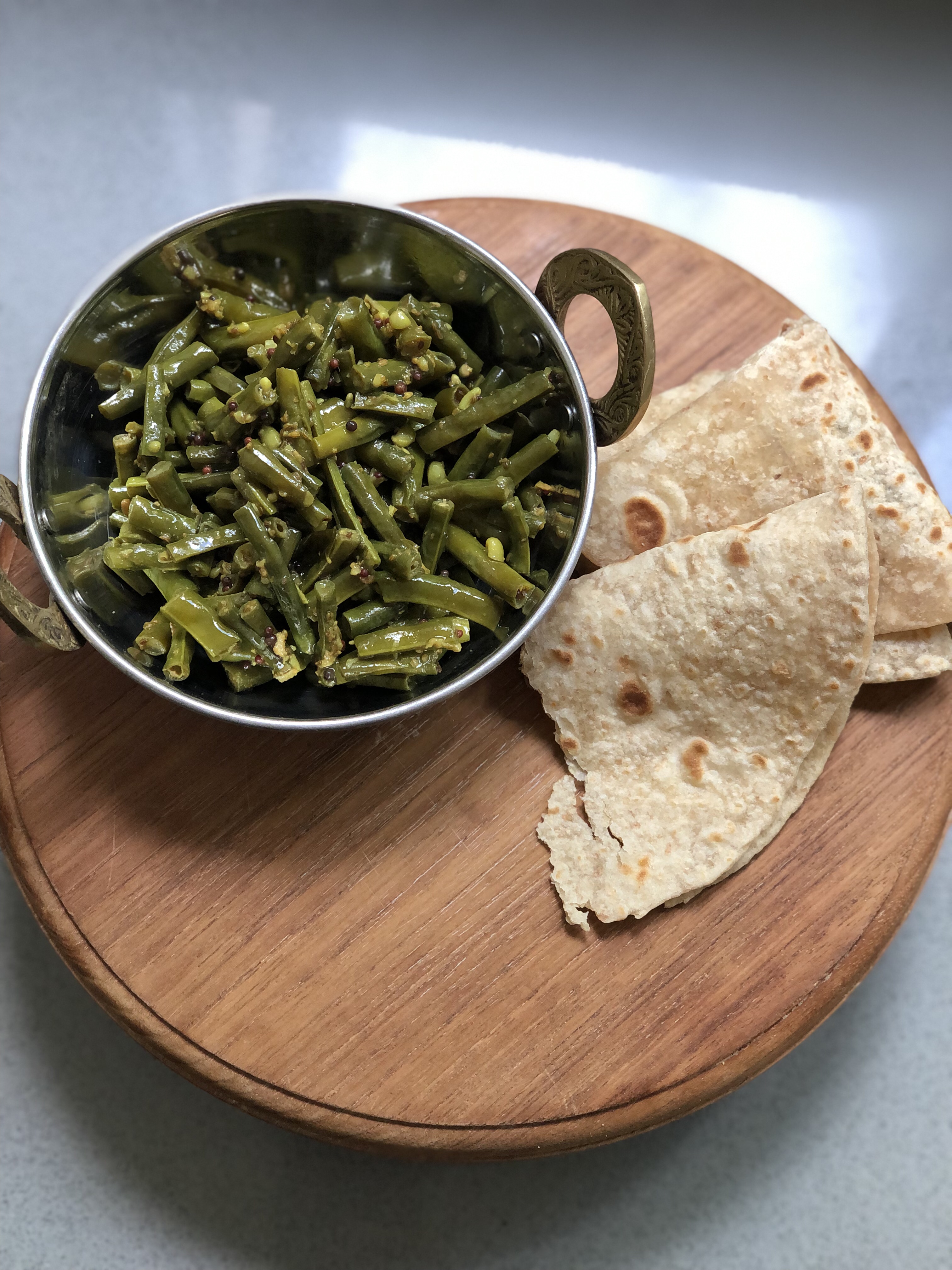 Young green Chori is snapable and tender – all you need to do is top and tail them and cut into bite size pieces. The pods that have small beans in them can be included.