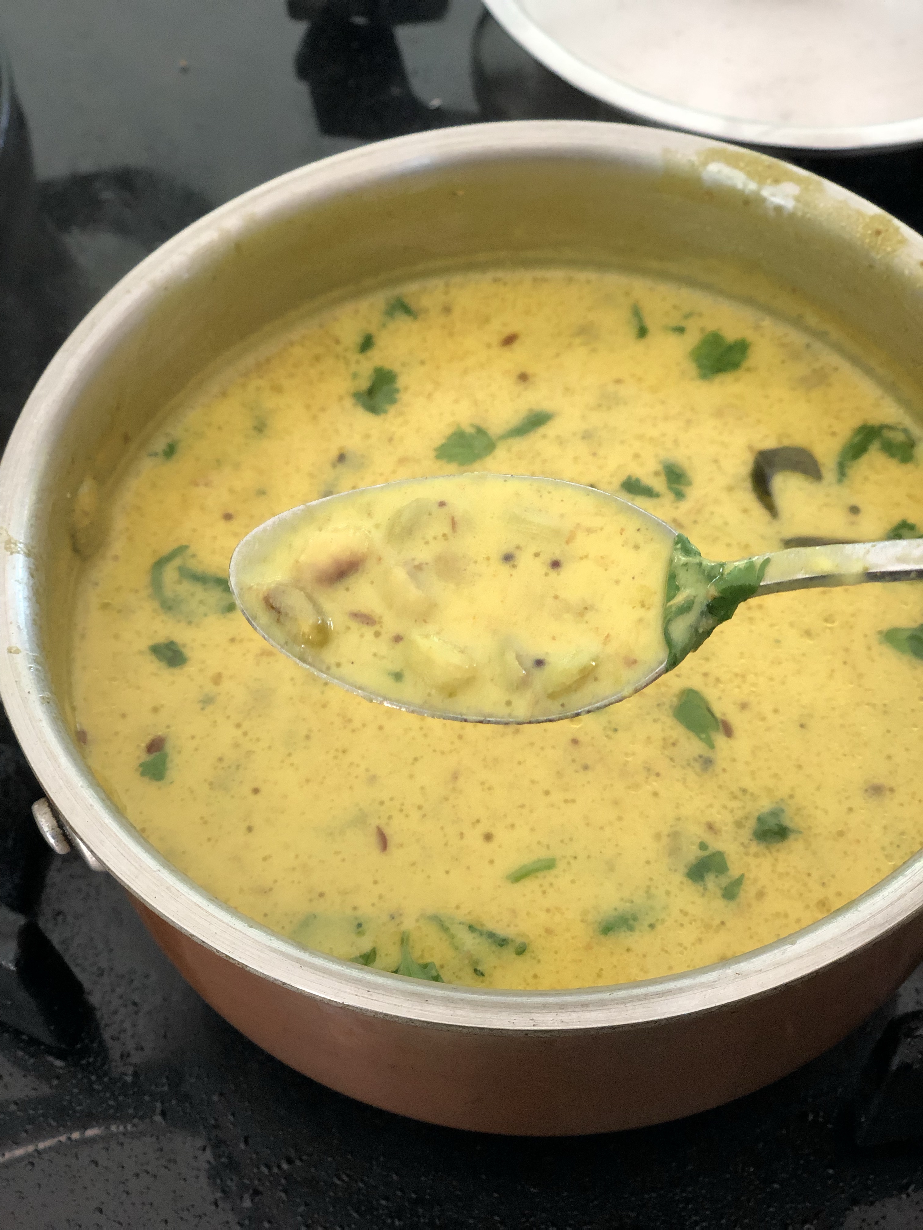 - Test for seasoning, simmer and garnish with chopped dhania.